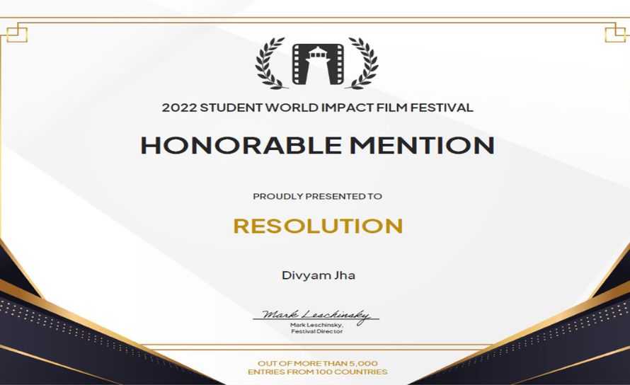 In a stupendous achievement, Mr. Divyam Jha, a student of KIIT School of Film & Media Sciences has won Honourable Mention for his film “RESOLUTION” at the 2022 Student World Impact Film Festival. This is a remarkable achievement considering there were more than 5000 entries from 100 participating countries. Mr. Divyam Jha is a 3rd year student of Bachelor of Film & Television Production (BFTP) programme.